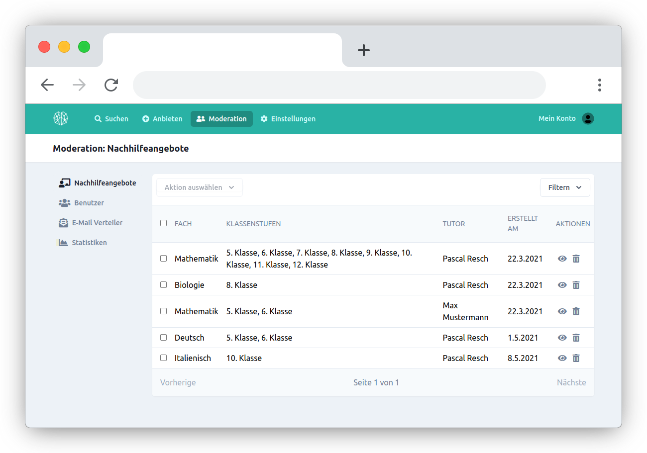 Das Portal bietet verschiedene Funktionen zur Verwaltung und Moderation der Benutzer und Nachhilfeangebote. Diese Aufgaben werden z.B. von der SMV oder Vertrauenslehrkräften übernommen: